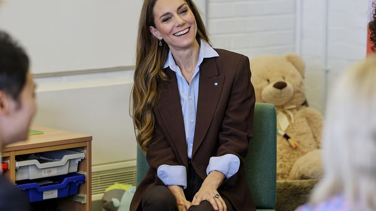 Při návštěvě Castle Hill Academy v Croydonu u příležitosti Children’s Mental Health Week, kterou podporuje jako patronka charity Place2Be, vsadila na čokoládově hnědý komplet. Sako v teplém hnědém tónu doplnily kalhoty ve stejné barvě, do pasu stažené páskem, a světle modrá košile značky With Nothing Underneath s ležérně vyhrnutými rukávy. Hnědá je pro ni v posledních měsících sázkou na jistotu, ale kombinace s modrou přidala outfitu lehkost a módní rytmus, který jsme viděli na přehlídkách Prada nebo Stella McCartney pro sezonu podzim 2026.