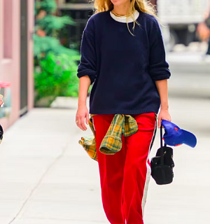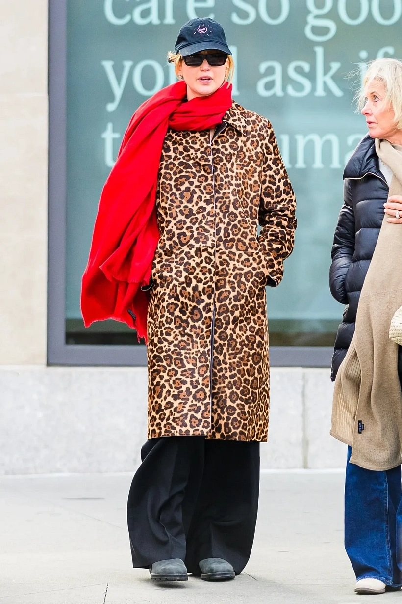 Na ulicích velkoměsta byla vyfocena v semišovém leopardím kabátu, který doplnila o volné černé kalhoty, robustní černé kotníkové boty a námořnickou baseballovou čepici s potiskem. Celý look pak rozzářila výrazná červená šála, která se stala nepopiratelným středobodem outfitu.
