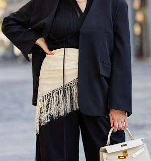 Jedním z nejstylovějších způsobů, jak letos nosit čtvercový hedvábný šátek, je uvázat ho kolem boků a nechat splývat do tvaru trojúhelníku. Outfit tak získá zajímavé vrstvení a nový rozměr. Skvěle funguje například přes klasické džíny, kde vynikne kontrast pevného denimu a jemného hedvábí.