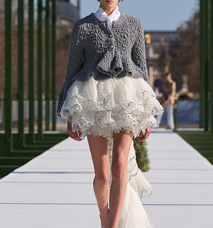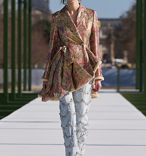 Na přehlídce se objevilo několik variací Bar jacket – například ze zlatého lamé, asymetricky staženého a lemovaného beránkem. Tentokrát však nebyl kombinován s tradiční A line sukní ale světlými džínami zdobenými stříbrným vzorem inspirovaným slavnými šaty Junon z roku 1949. Vedle odkazů na historii domu Dior se v kolekci objevily také inspirace jinými módními a historickými zdroji. Některé modely připomínaly estetiku návrháře Paula Poireta, například prostřednictvím balonových kalhot či květinových lamé látek. Dalším motivem byly kabáty inspirované pánskou módou 18. století, doplněné o výrazné kaskádové límce z kožešiny z krajky.
