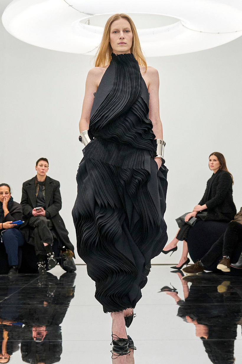 Mezi jeho nečekané kreace patřily „kokonové“ modely zahalující paže až po kolena, zatímco smyslnější střihy zahrnovaly úzké asymetrické šaty s kapucemi a vysoké punčochy s dlouhými střapci.