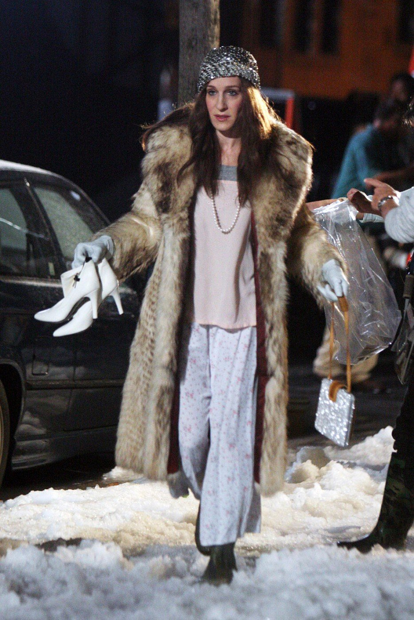 A pak je tu samozřejmě kultovní Carrie Bradshaw o silvestrovském večeru, v zasněženém New Yorku, v něžných pyžamových kalhotách oblečených s podpatky, kožichem a flitrovou čepičkou. Což je zkrátka postoj, který nejde slepě kopírovat, potřebujete, aby vám koloval v žilách.
