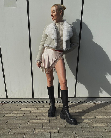 Kombinace party oblečení s tím, které nosíte na běžný den, je zárukou skvělého outfitu. Sukně s třásněmi bude skvěle fungovat v kombinaci s tlustým svetrem a kozačkami. Pro dostatek tepla můžete celou kombinaci ještě doplnit dlouhým kabátem.