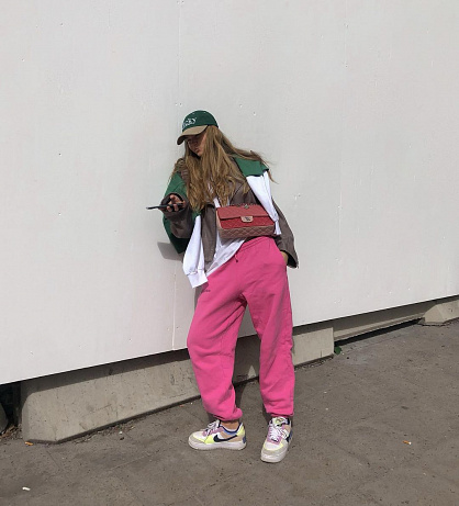 Nebojte se ani výrazných růžových tepláků, proč se stále držet jen neutrálních barev, když je paleta tak široká a pestrá. Oblékněte je třeba ke křiváku a doplňte dalšími pestrobarevnými detaily. Pokud ale budete chtít držet zbytek outfitu minimalistický, zkuste k nim třeba čistě bílé tenisky, top a kabelku.