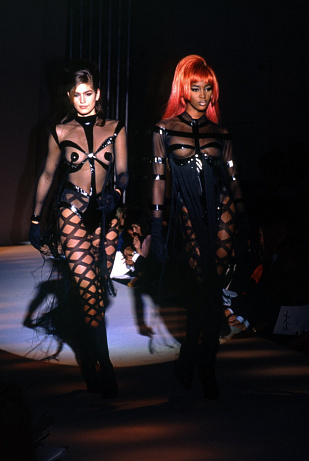 Cindy Crawford a Naomi Campbell na defilé přehlídky Thierry Mugler, Prêt-à-Porter, 1991