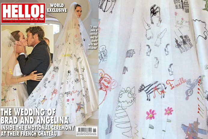 Jolie se v roce 2014 provdala za Brada Pitta ve svatebních šatech od italského domu Versace. Donatella Versace navrhla róbu s vlečkou, kterou zdobily kresby dětí Jolie.