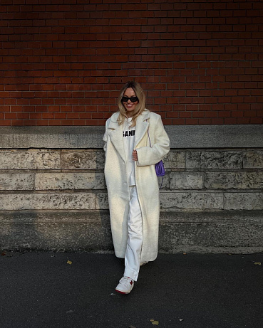 Celobílé kombinace ještě nikdy nebyly tak populární. Svatý Martin sice na bílém koni nepřijel, ale vy můžete. Dlouhý bílý kabát, bílé kalhoty a bílé tenisky s barevným detailem doplňte o barevnou kabelku, ať monolit rozbijete něčím hravým.