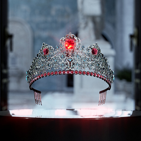 Tiara, kterou Domenico Dolce a Stefano Gabbana viděli ve svých snech. Důležitá pro ně byla tyrkysová barva připomínající moře obklopující Benátky a červená reprezentující barokní styl a vášeň města.