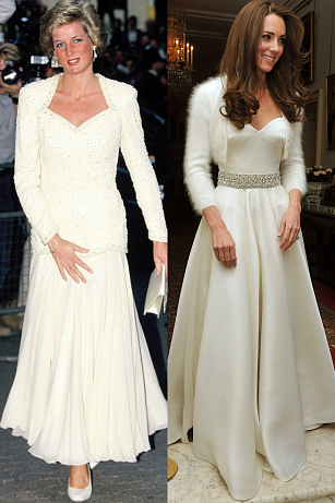 Diana v roce 1988; Kate při příchodu na recepci do Clarence House – po svatbě v dubnu 2011.