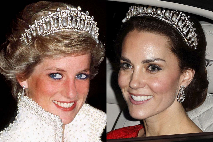 Diana v Hong Kongu v roce 1989; Kate se stejnou tiárou v Buckinghamském paláci, v prosinci 2016.