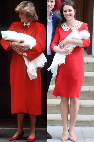 Princezna Diana při odchodu ze St. Mary's Hospital s novorozeným princem Harrym v roce 1984; Vévodkyně Kate opustila stejnou nemocnici v roce 2018 s novorozeným synem Princem Louisem v podobných červených šatech s bílým krajkovým límcem.