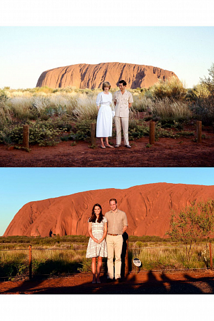 Diana a Charles v Ayers Rock v Austrálii v roce 1983; Kate a William v Ayers Rock v roce 2014.