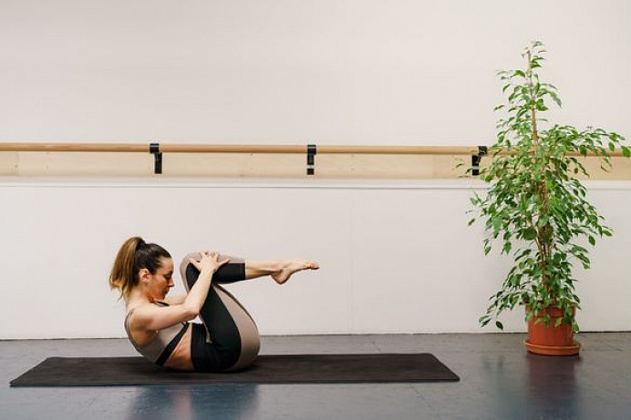 Zpevněte břišní svaly a přitlačte čelo ke kolenům. Uchopte holeně.